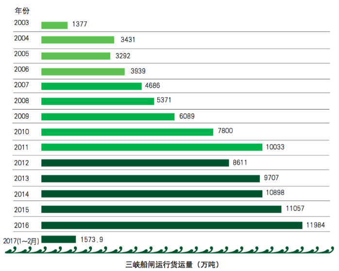 三峽工程是治理和開發長江的關鍵性骨干工程,對推動長江經濟帶發展具有重要意義。三峽工程蓄水后,極大地促進了長江航運的快速發展和沿江經濟社會的協調發展,使長江“黃金水道”實至名歸,有力地支持了長江經濟帶戰略的實施。目前,三峽船閘全年過閘貨運量是三峽工程蓄水前該河段年最高貨運量的6倍以上。